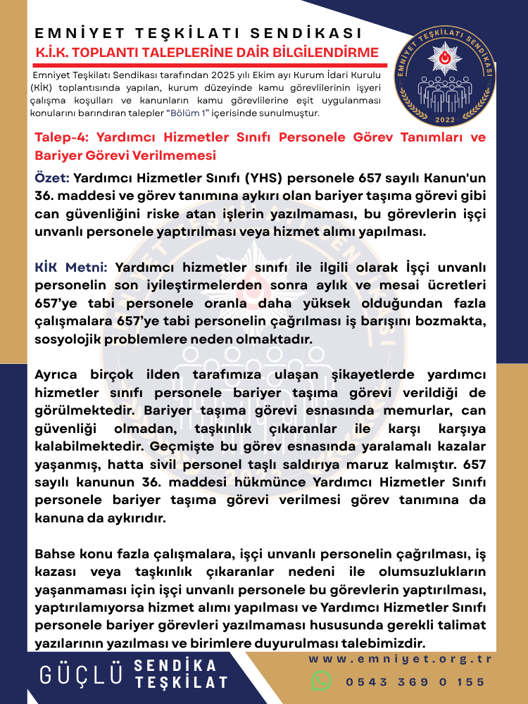 Özet: Yardımcı Hizmetler Sınıfı (YHS) personele 657 sayılı Kanun’un 36. maddesi ve görev tanımına aykırı olan bariyer taşıma görevi gibi can güvenliğini riske atan işlerin yazılmaması, bu görevlerin işçi unvanlı personele yaptırılması veya hizmet alımı yapılması.