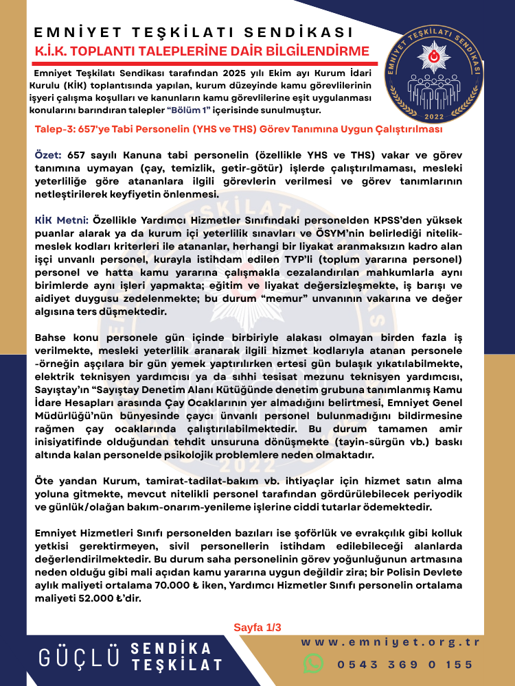 KİK Metni: Özellikle Yardımcı Hizmetler Sınıfındaki personelden KPSS’den yüksek puanlar alarak ya da kurum içi yeterlilik sınavları ve ÖSYM’nin belirlediği nitelik-meslek kodları kriterleri ile atananlar, herhangi bir liyakat aranmaksızın kadro alan işçi unvanlı personel, kurayla istihdam edilen TYP’li (toplum yararına personel) personel ve hatta kamu yararına çalışmakla cezalandırılan mahkumlarla aynı birimlerde aynı işleri yapmakta; eğitim ve liyakat değersizleşmekte, iş barışı ve aidiyet duygusu zedelenmekte; bu durum “memur” unvanının vakarına ve değer algısına ters düşmektedir.