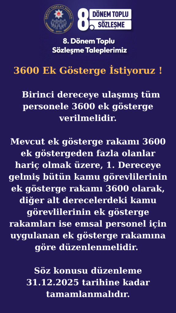 Mevcut ek gösterge rakamı 3600 ek göstergeden fazla olanlar hariç olmak üzere, 1. Dereceye gelmiş bütün kamu görevlilerinin ek gösterge rakamı 3600 olarak, diğer alt derecelerdeki kamu görevlilerinin ek gösterge rakamları ise emsal personel için uygulanan ek gösterge rakamına göre düzenlenmelidir.