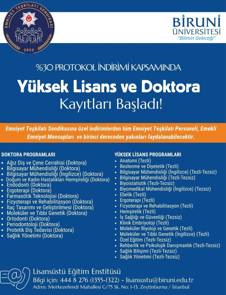 Biruni Üniversitesi ile imzaladığımız protokol kapsamında; Tüm emniyet personeli, emekli mensuplarımız ve 1. derece yakınları için akademik kariyerde dev fırsat:
