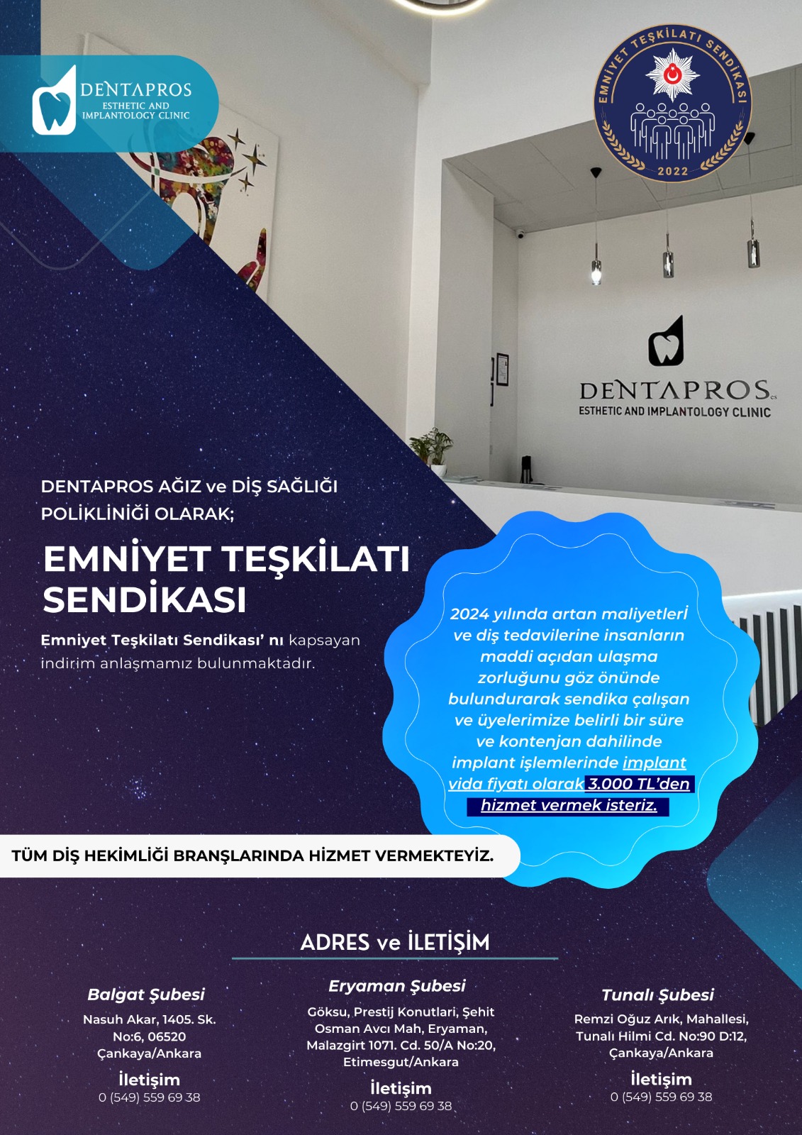 Emniyet Teşkilatı Sendikası olarak Dentapros Ağız ve Diş Sağlığı Polikliniği ile iş birliği yaparak sizlere özel indirim anlaşması sağladık! Bu indirimden üyelerimiz, emniyet personeli, emekli mensuplar ve 1. derece yakınlar faydalanabilir. 2024 yılında artan maliyetler ve diş tedavilerindeki insani maddi açığı değerlendiren sendikamız, üyelerimize belirli bir süre implant işlemlerinde implant başına 3.000 TL hizmet vermektedir. Tüm diş hekimliği branşlarında hizmet verilmektedir. Şubeler: