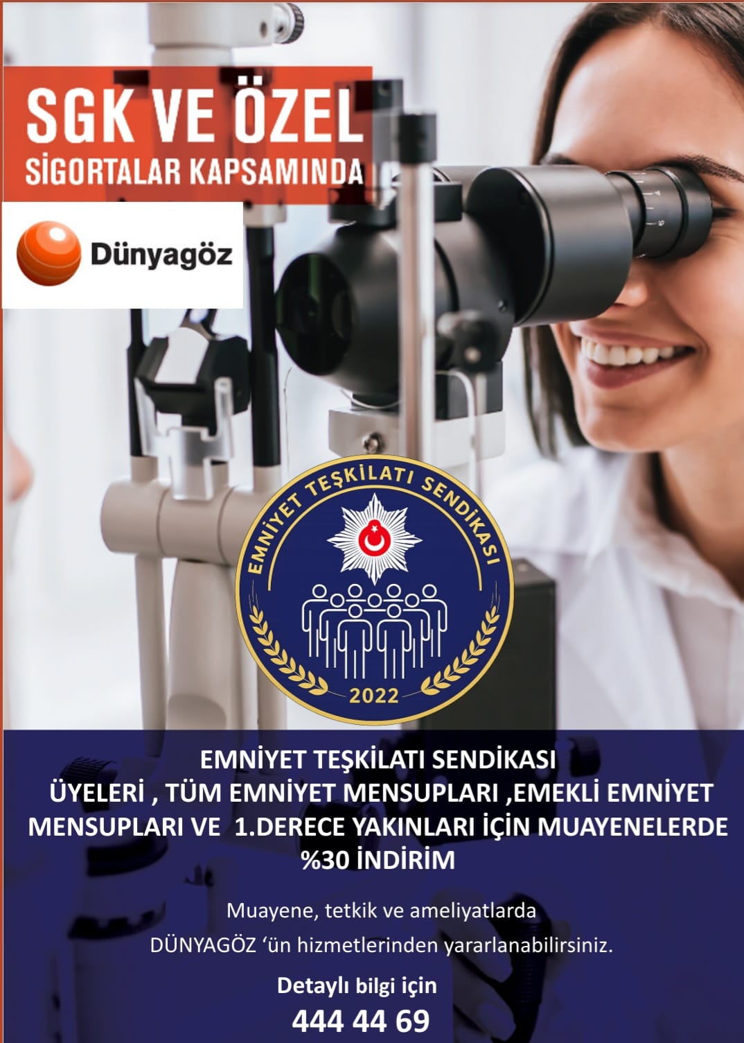 SGK ve özel sigortalar kapsamında yapılan anlaşma çerçevesinde; sendika üyelerimiz, tüm aktif ve emekli emniyet mensupları ile 1. derece yakınları, Dünyagöz bünyesinde sunulan sağlık hizmetlerinden %30 indirimli olarak faydalanabilecektir.