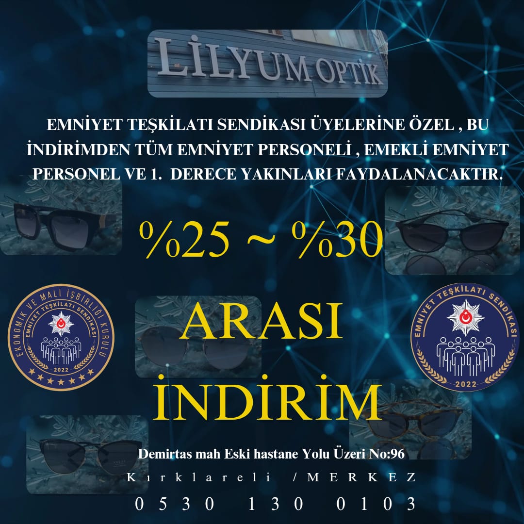Emniyet Teşkilatı Sendikası olarak Lilyum Optik ile iş birliğiyle sizlere özel %25-%30 indirim fırsatı sunuyoruz! Bu indirimden tüm emniyet personeli, emekli emniyet personeli ve 1. derece yakınları faydalanabilir.