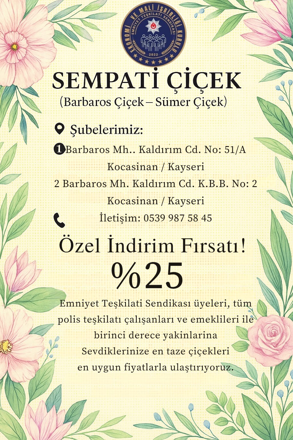 Emniyet Teşkilatı Sendikası ile Sempati Çiçek arasında %25 indirim anlaşması imzalanmıştır.