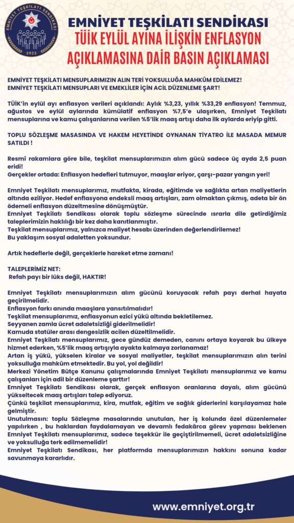 TÜİK’in eylül ayı enflasyon verileri açıklandı: Aylık %3,23, yıllık %33,29 enflasyon! Temmuz, ağustos ve eylül aylarında kümülatif enflasyon %7,5’e ulaşırken, Emniyet Teşkilatı mensuplarına ve kamu çalışanlarına verilen %5’lik maaş artışı daha ilk aylarda eriyip gitti.