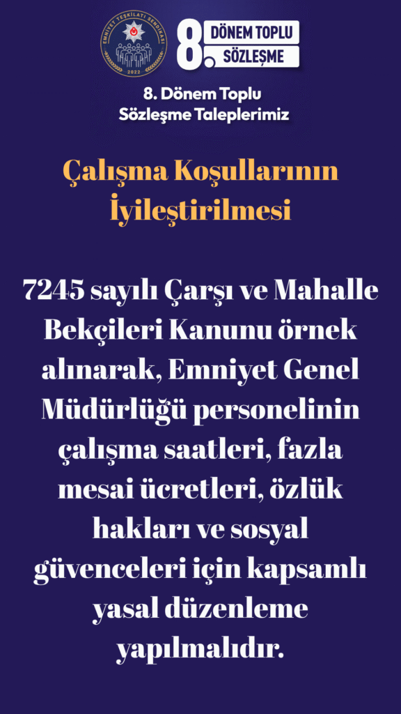 7245 sayılı Çarşı ve Mahalle Bekçileri Kanunu örnek alınarak, Emniyet Genel Müdürlüğü personelinin çalışma saatleri, fazla mesai ücretleri, özlük hakları ve sosyal güvenceleri için kapsamlı yasal düzenleme yapılmalıdır.