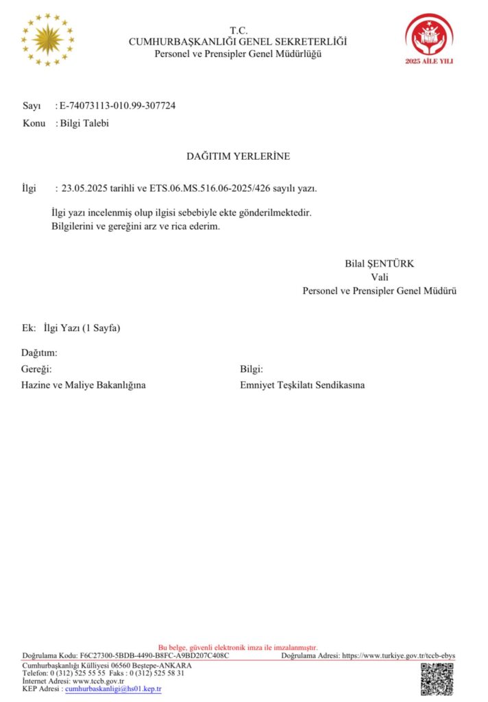 Cumhurbaşkanlığı Genel Sekreterliği tarafından talebimiz incelenmiş, konunun ilgili mercii olan Hazine ve Maliye Bakanlığı’na iletildiği tarafımıza resmi olarak bildirilmiştir.