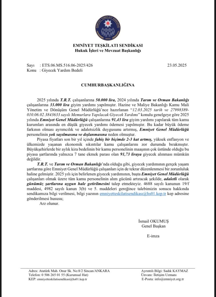 Emniyet Teşkilatı Sendikası olarak, diğer kamu kuruluşlarında 55.000 Türk Lirasına kadar varan giyecek yardımına karşın Emniyet Genel Müdürlüğü personeline yalnızca 91,43 TL gibi sembolik dahi sayılamayacak bir tutar verildiğini kamuoyu ile paylaşmış , bu adaletsizliğin giderilmesi için Sayın Cumhurbaşkanlığı makamına doğrudan yazılı başvuruda bulunmuştuk.