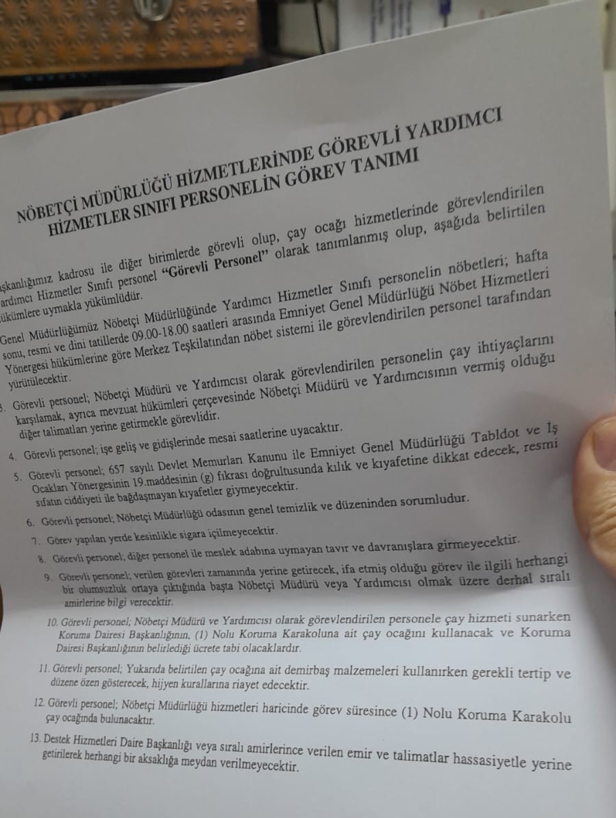 Destek Hizmetleri Daire Başkanlığı tarafından imzalanan Nöbetçi Müdürlüğü Hizmetlerinde Görevli Yardımcı Hizmetler Sınıfı Personelin Görev Tanımı isimli yazıda, hafta sonu, resmi ve dini tatillerde, nöbet sistemi ile görevlendirilen devlet memurların yapması gereken görevler maddesinde çay servisi, çay ocağı temizliği ile alakalı yazılı emir verilmiştir.