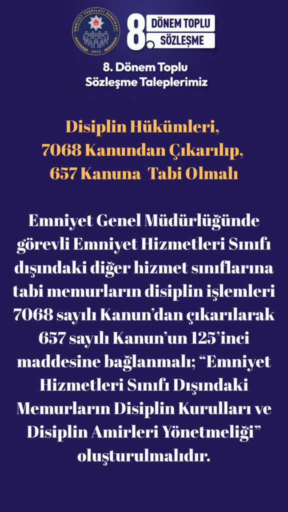 Emniyet Genel Müdürlüğünde görevli Emniyet Hizmetleri Sınıfı dışındaki diğer hizmet sınıflarına tabi memurların disiplin işlemleri 7068 sayılı Kanun’dan çıkarılarak 657 sayılı Kanun’un 125’inci maddesine bağlanmalı; “Emniyet Hizmetleri Sınıfı Dışındaki Memurların Disiplin Kurulları ve Disiplin Amirleri Yönetmeliği” oluşturulmalıdır.