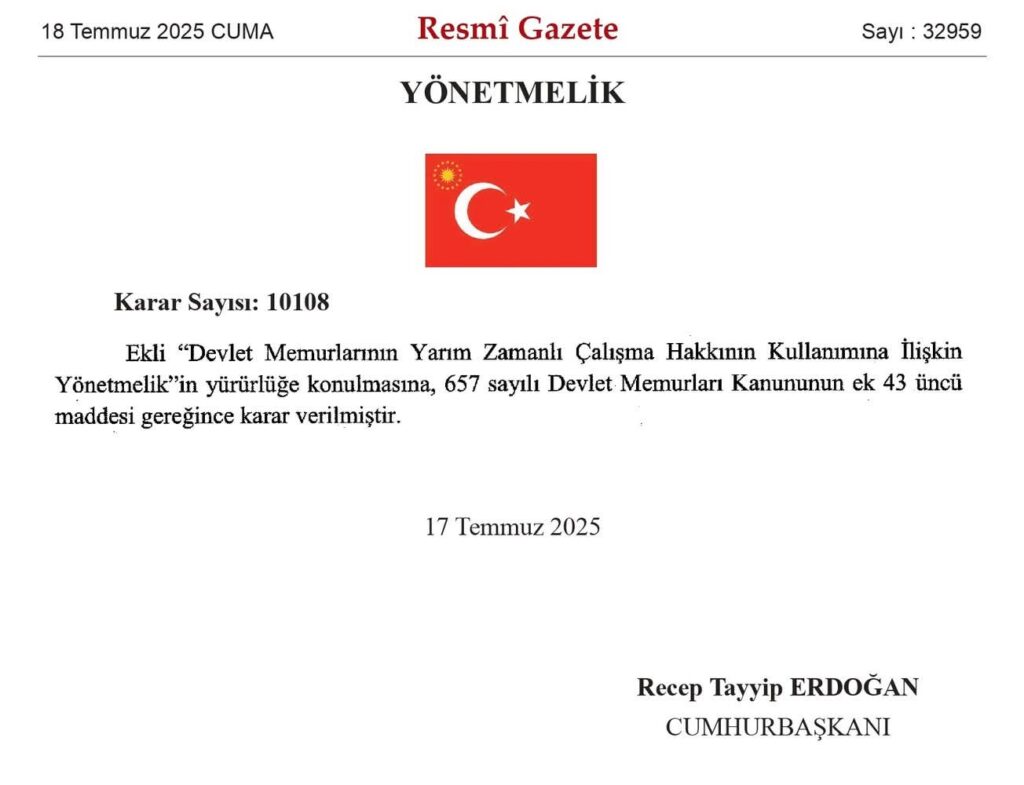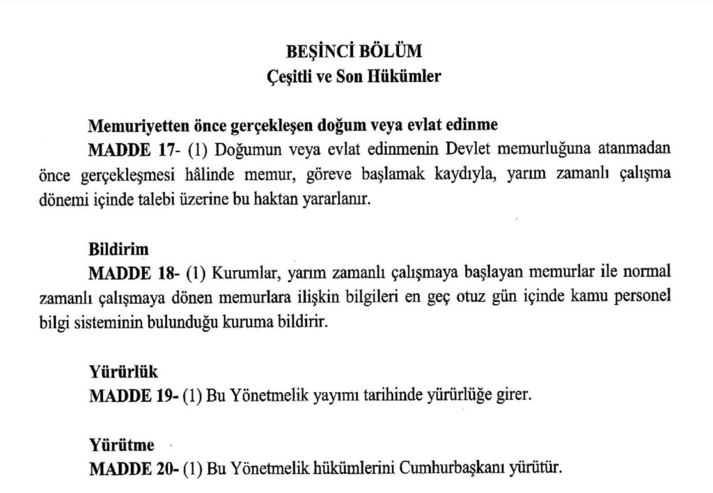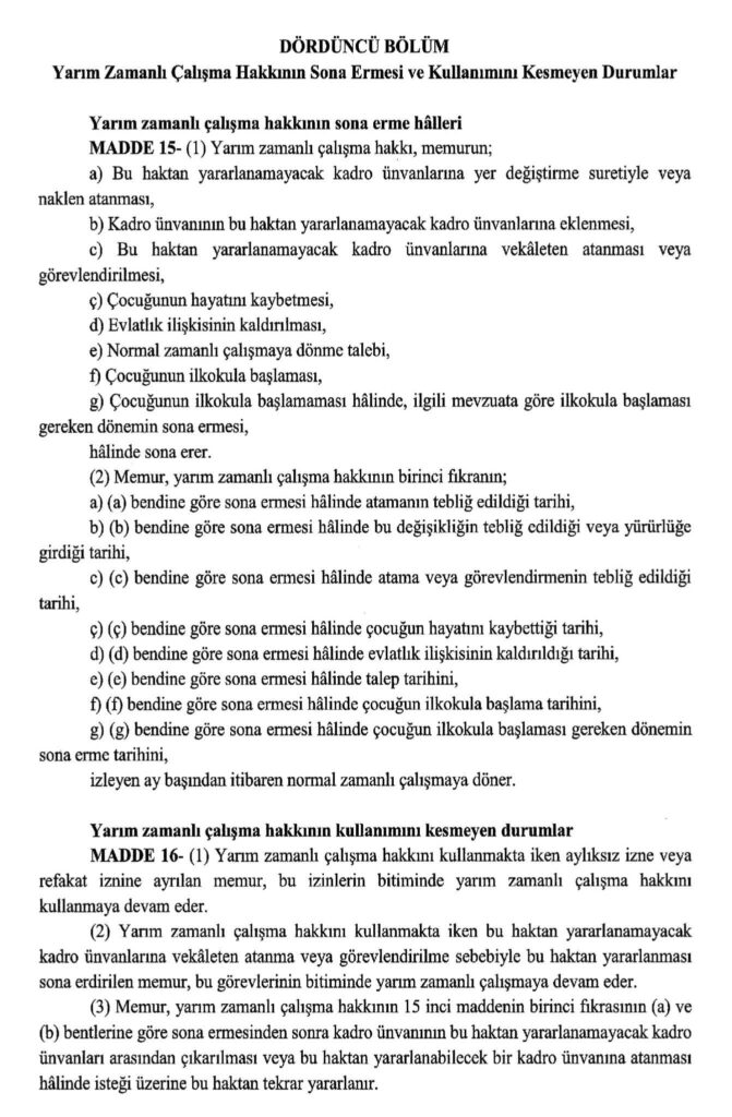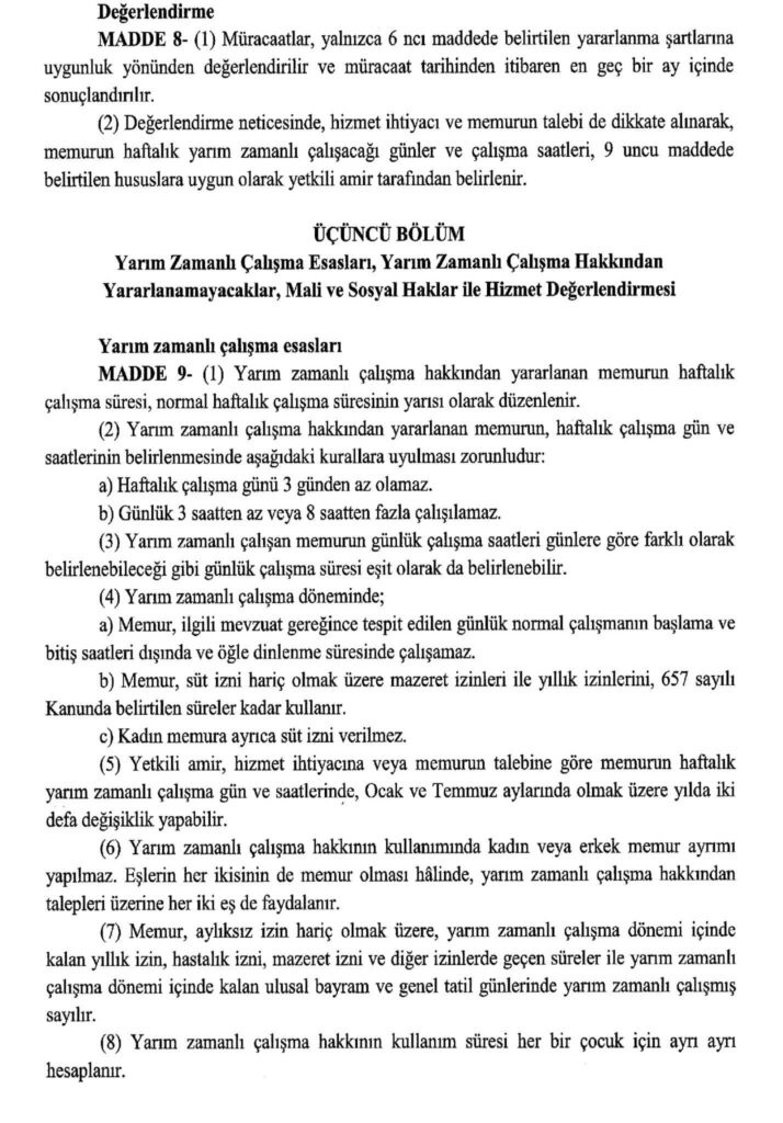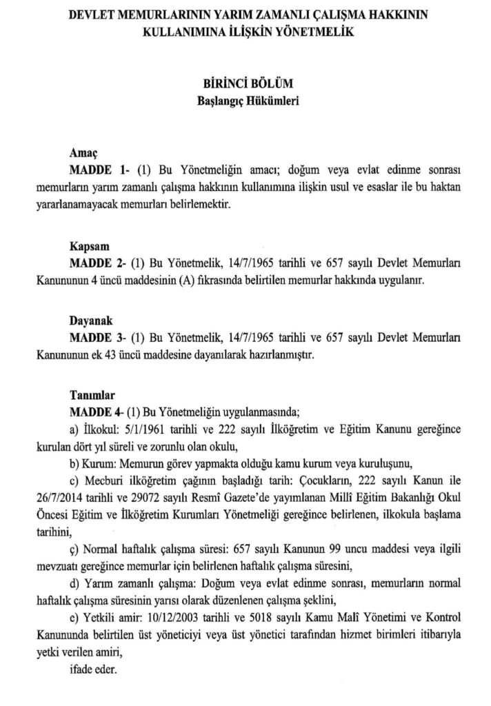 657 Sayılı Devlet Memurları Kanuna tabi memurlar doğumdan itibaren ilk öğretim çağına başlayana kadar yarım zamanlı çalışabilecek.
