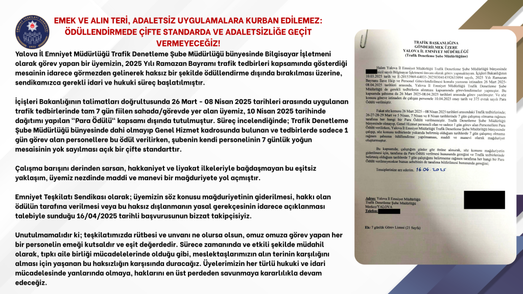 Yalova İl Emniyet Müdürlüğü Trafik Denetleme Şube Müdürlüğü bünyesinde Bilgisayar İşletmeni olarak görev yapan bir üyemizin, 2025 Yılı Ramazan Bayramı trafik tedbirleri kapsamında gösterdiği mesainin idarece görmezden gelinerek haksız bir şekilde ödüllendirme dışında bırakılması üzerine, sendikamızca gerekli idari ve hukuki süreç başlatılmıştır.