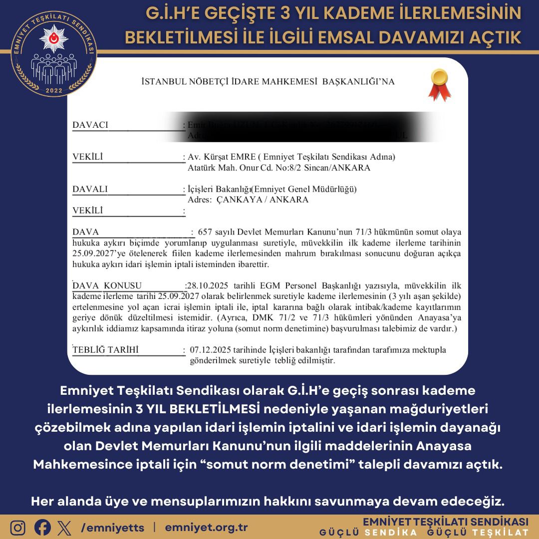 Emniyet Teşkilatı Sendikası olarak G.İ.H.’e geçiş sonrası kademe ilerlemesinin 3 YIL BEKLETİLMESİ nedeniyle yaşanan mağduriyetleri çözebilmek adına yapılan idari işlemin iptalini ve idari işlemin dayanağı olan Devlet Memurları Kanunu’nun ilgili maddelerinin Anayasa Mahkemesince iptali için “somut norm denetimi” talepli davamızı açtık. Yürütülen hukuki sürecin mimarı olan Hukuk ve Mevzuat Komisyonumuza,
