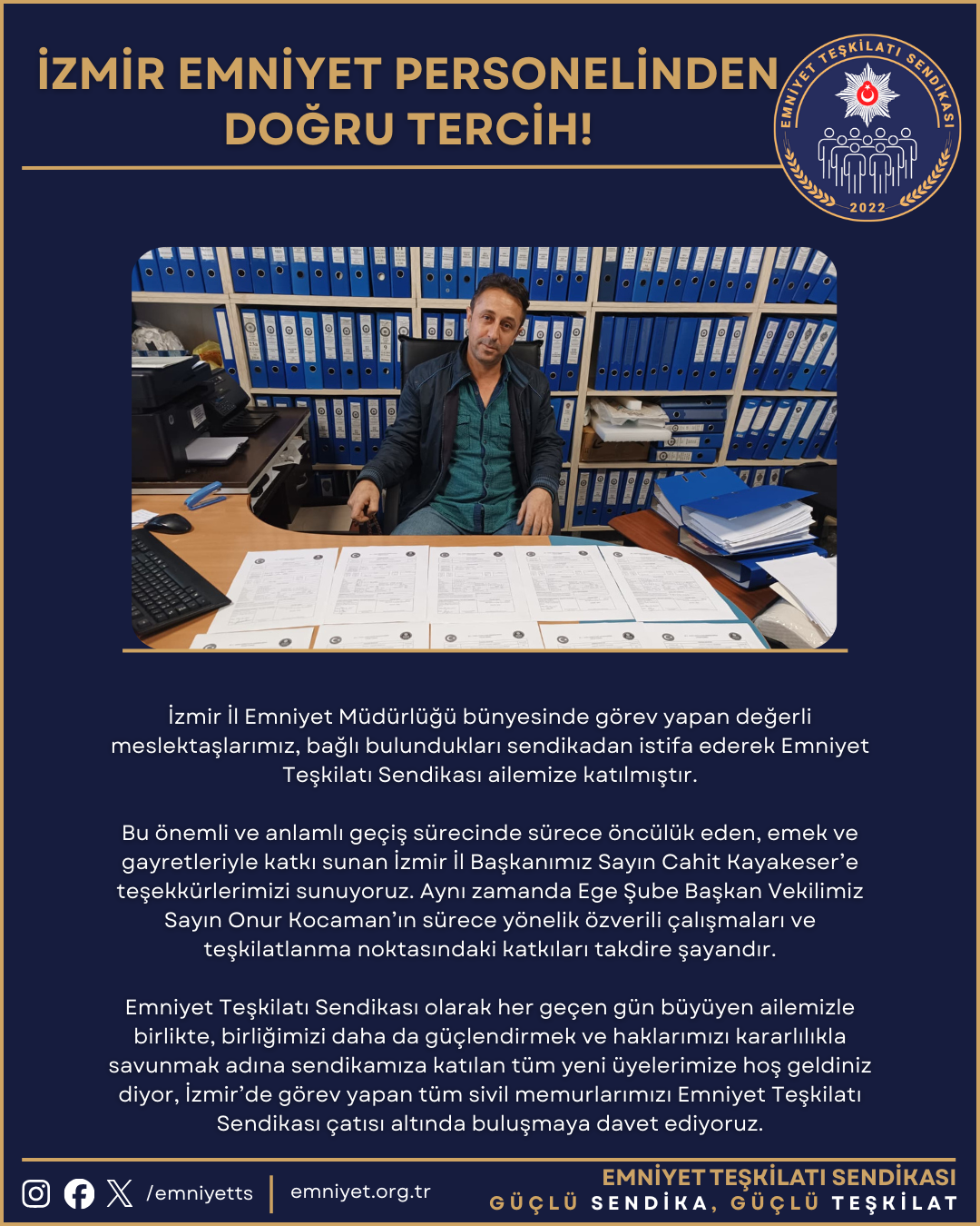 Mersin Tarsus İlçe Emniyet Müdürlüğü bünyesinde görev yapan ve sarı sendikadan istifa ederek akın akın sendikamıza katılan 11 değerli meslektaşımıza ve toplamda 12 yeni üyemize Emniyet Teşkilatı Sendikamıza hoş geldiniz diyor ve teşekkür ediyoruz. Bu önemli geçiş sürecine öncülük eden, emek ve gayretleriyle büyük katkı sunan Sayın Koray Aksoy’a teşekkürlerimizi
