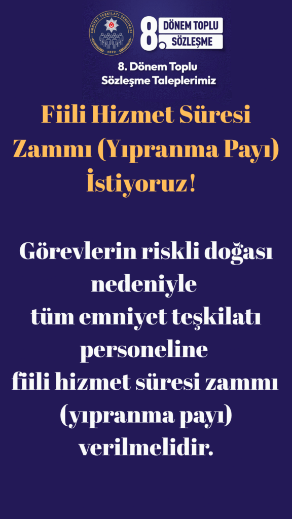 Görevlerin riskli doğası nedeniyle tüm emniyet personeline fiili hizmet süresi zammı (yıpranma payı) verilmelidir.
