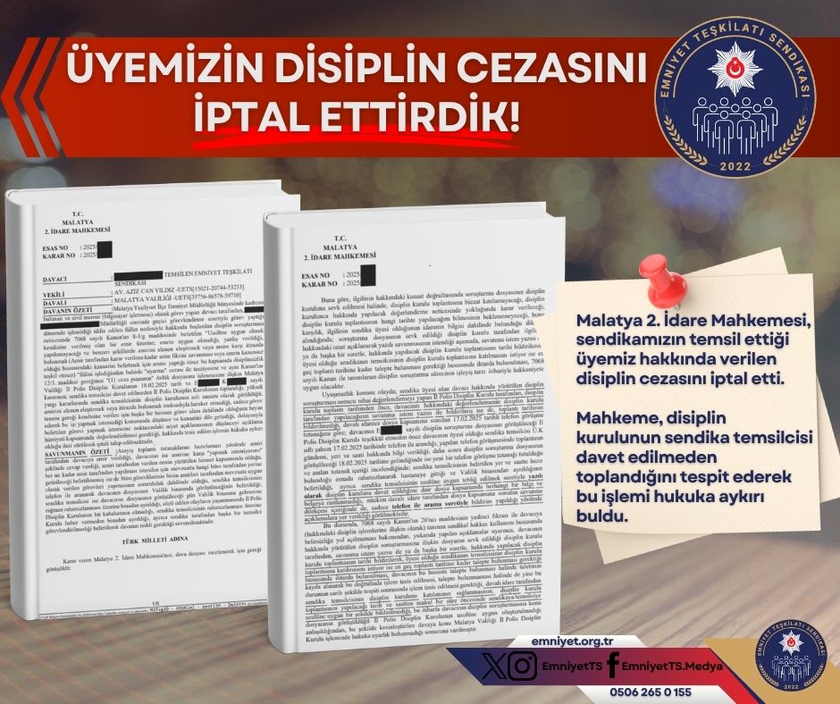 Malatya 2. İdare Mahkemesi, sendikamızın temsil ettiği üyemiz hakkında verilen disiplin cezasını iptal etti.
