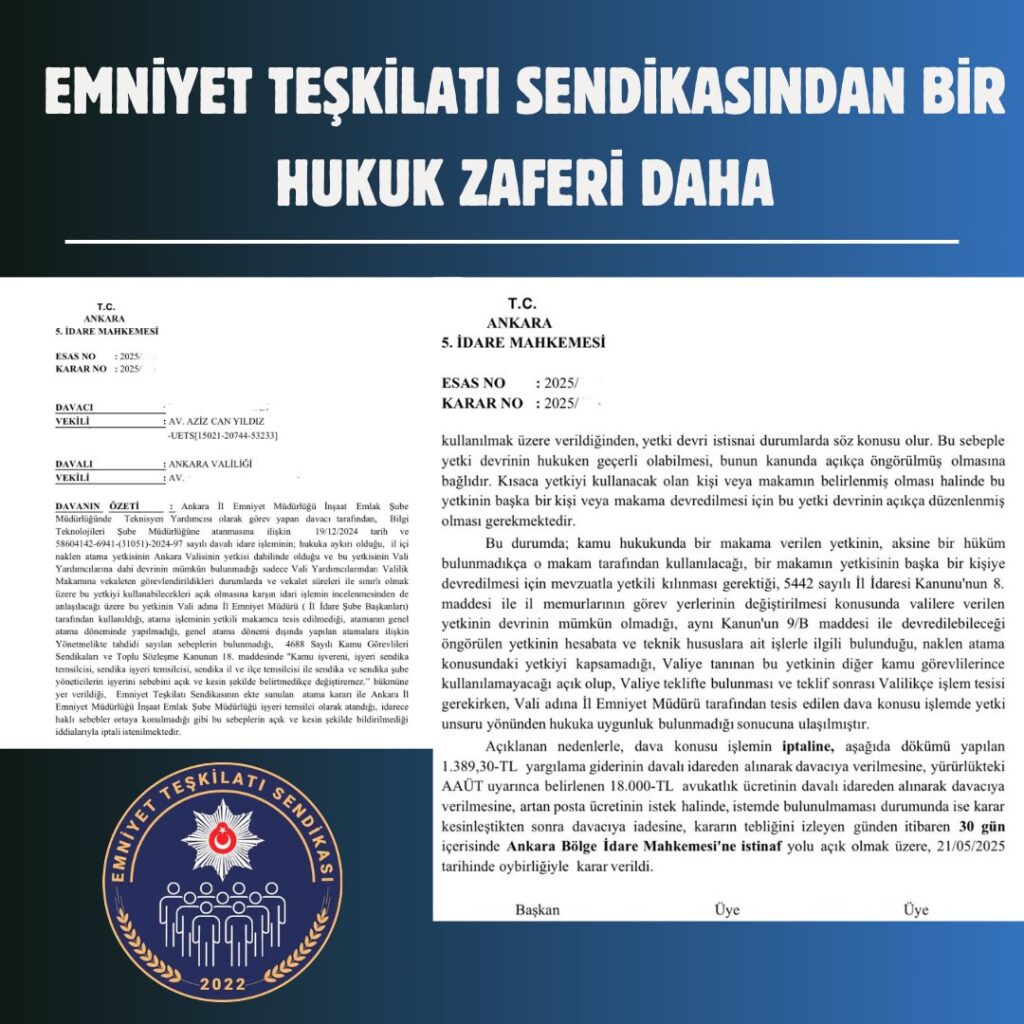 Ankara İl Emniyet Müdürlüğü bünyesinde görev yapan bir üyemiz adına Ankara 5. İdare Mahkemesinde açılan davada üyemizin haksız şekilde gerçekleştirilen atama işlemi iptal edilmiştir.