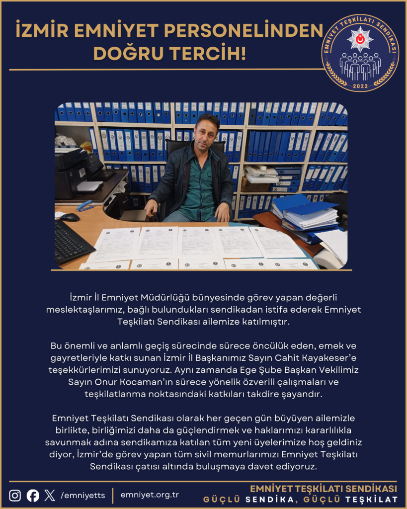 Emniyet Teşkilatı Sendikası olarak her geçen gün büyüyen ailemizle birlikte, birliğimizi daha da güçlendirmek ve haklarımızı kararlılıkla savunmak adına sendikamıza katılan tüm yeni üyelerimize hoş geldiniz diyor, İzmir’de görev yapan tüm sivil memurlarımızı Emniyet Teşkilatı Sendikası çatısı altında buluşmaya davet ediyoruz.