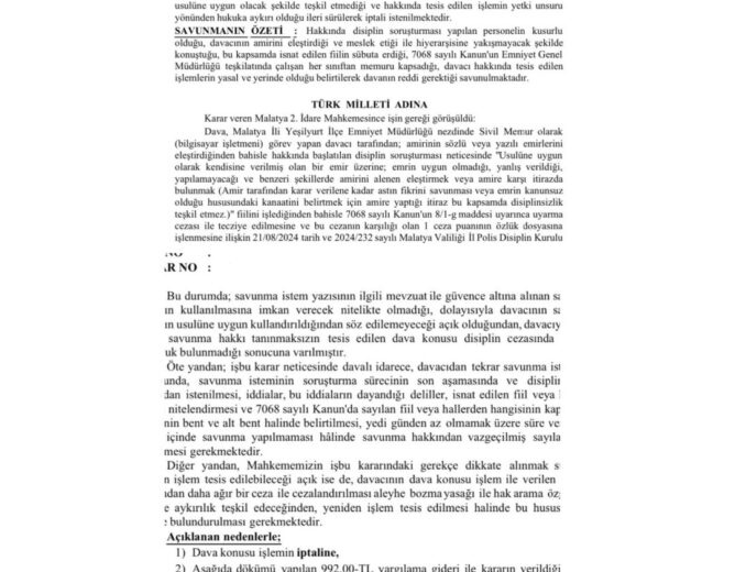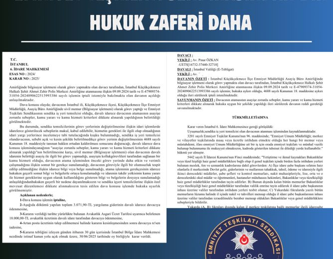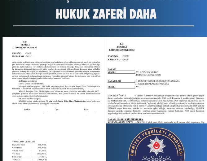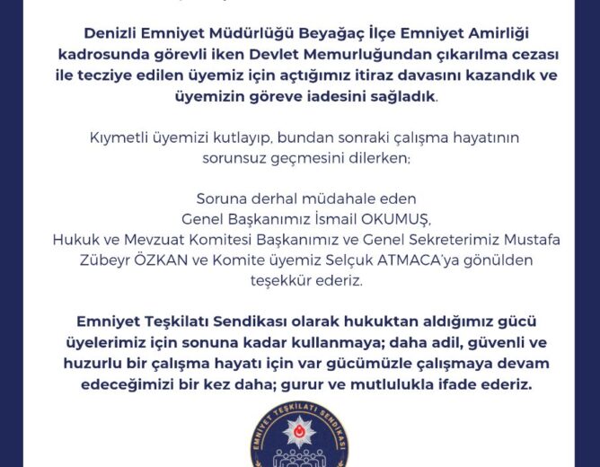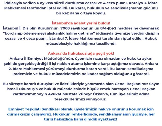 BİR HUKUK ZAFERİ DAHA!ÜYEMİZİN CEZASINI İPTAL ETTİRDİK! Emniyet Teşkilatı Sendikası olarak bir kez daha hukukun üstünlüğünü...