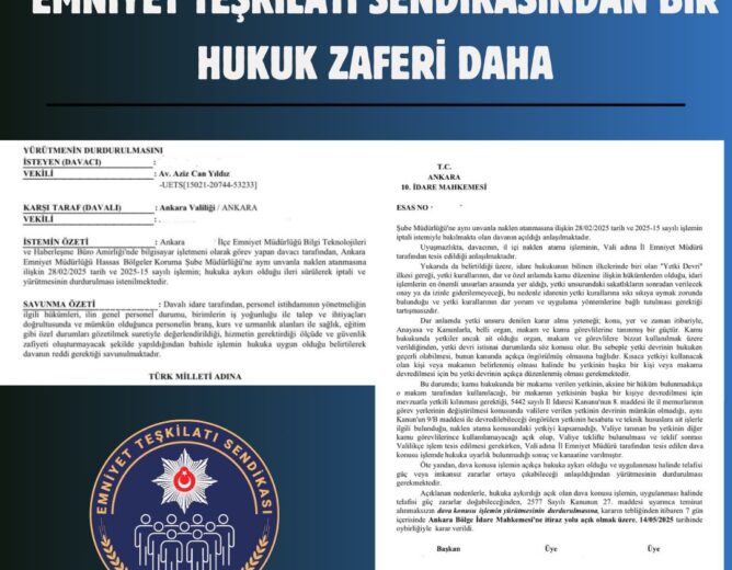 Emniyet Teşkilatı Sendikası olarak, üyelerimizin haklarını korumaya yönelik verdiğimiz hukuk mücadelesi zaferlerine bir yenisini daha ekledik....