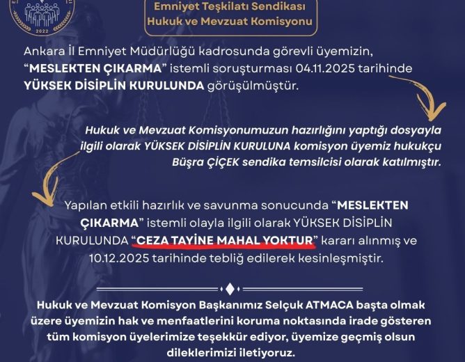 Ankara İl Emniyet Müdürlüğü kadrosunda görevli üyemizin, “MESLEKTEN ÇIKARMA” istemli soruşturması 04.11.2025 tarihinde YÜKSEK DİSİPLİN KURULUNDA...