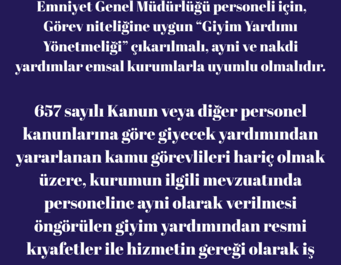 Emniyet Genel Müdürlüğü personeli için, Görev niteliğine uygun “Giyim Yardımı Yönetmeliği” çıkarılmalı, ayni ve nakdi yardımlar...