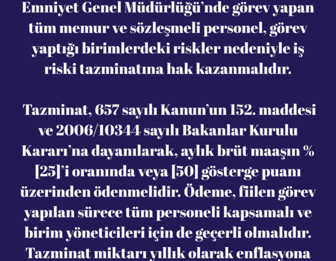 Emniyet Genel Müdürlüğü’nde görev yapan tüm memur ve sözleşmeli personel, görev yaptığı birimlerdeki riskler nedeniyle iş...