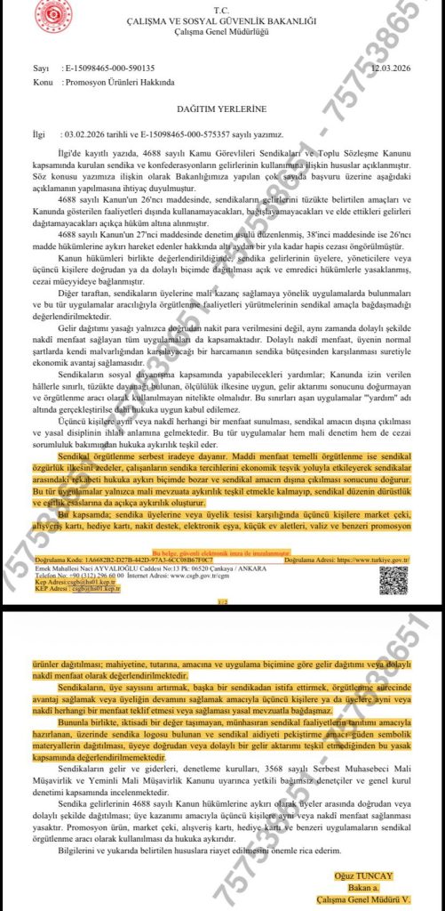 Çalışma ve Sosyal Güvenlik Bakanlığı Çalışma Genel Müdürlüğü’nün 12.03.2026 tarihli ve E-15098465-000-590135 sayılı yazısı ile sendikalar tarafından üyelere ve üyelik tesisi karşılığında üçüncü kişilere dağıtılan promosyon ürünlerine ilişkin önemli düzenlemeler hatırlatılmıştır.