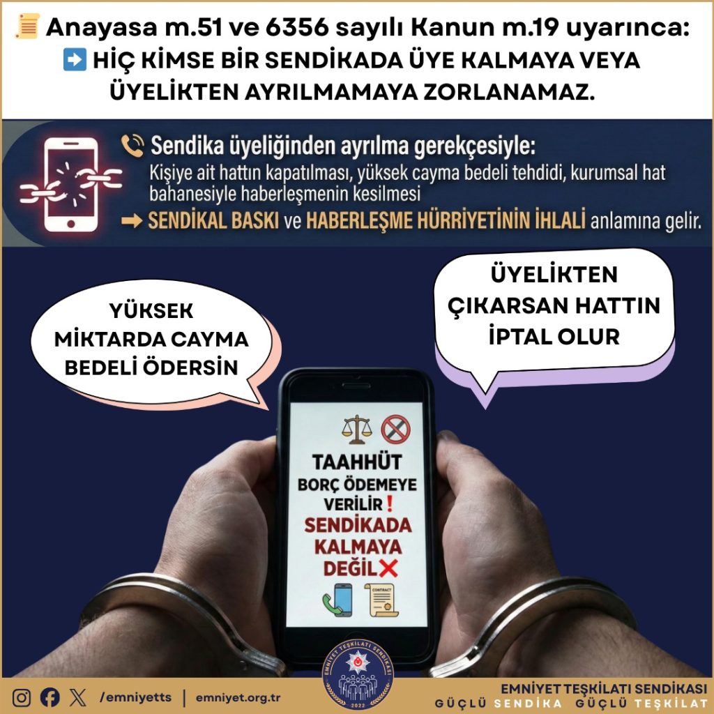 Bu uygulama hukuka açıkça aykırıdır. Anayasa’nın 51. maddesi ve 6356 sayılı Kanun’un 19. maddesi uyarınca: Hiç kimse bir sendikaya üye kalmaya veya üyelikten ayrılmamaya zorlanamaz.