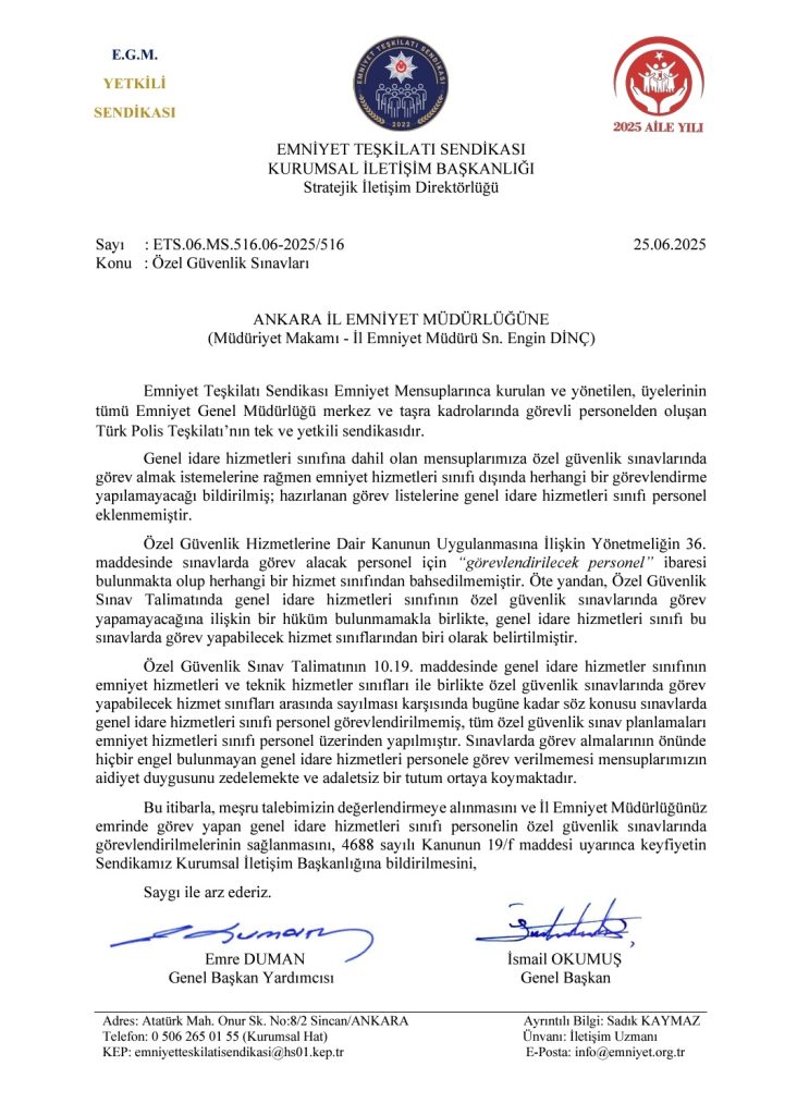 Ankara İl Emniyet Müdürlüğüne yazı yazarak genel idare hizmetleri sınıfına dahil personelin özel güvenlik sınavlarında planlanmasını talep ettik.