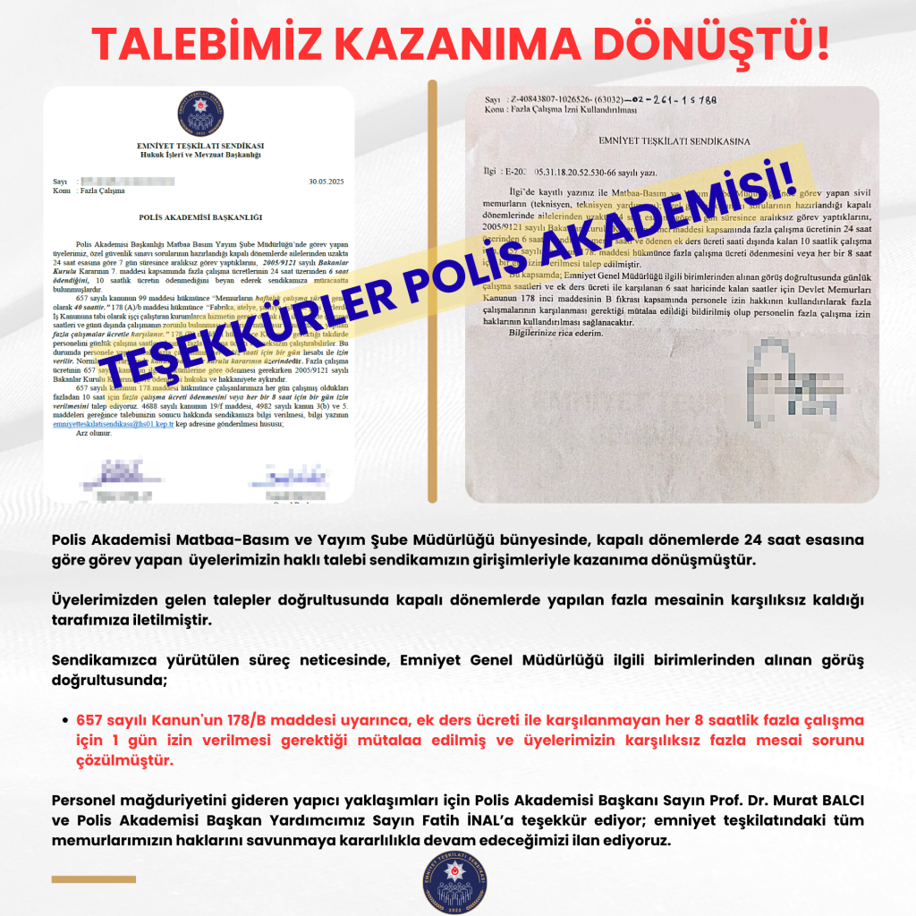 Polis Akademisi Matbaa-Basım ve Yayım Şube Müdürlüğü bünyesinde, kapalı dönemlerde 24 saat esasına göre görev yapan üyelerimizin haklı talebi sendikamızın girişimleriyle kazanıma dönüşmüştür.