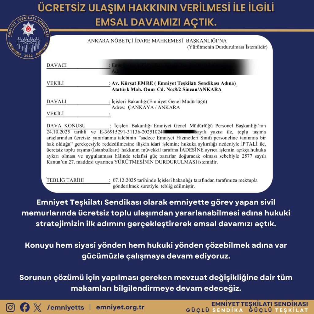Emniyet Teşkilatı Sendikası olarak emniyette görev yapan sivil memurların da ücretsiz ulaşımdan yararlanabilmesi adına hukuki stratejimizin ilk adımını gerçekleştirerek emsal davamızı açtık.