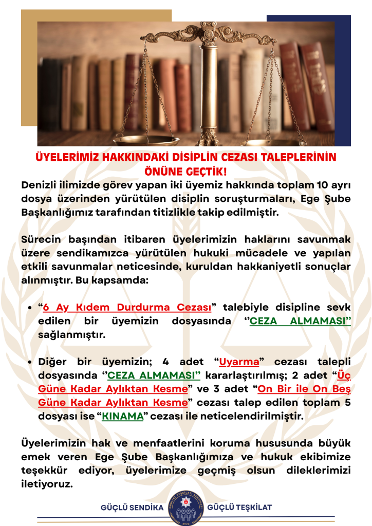 Denizli ilimizde görev yapan iki üyemiz hakkında toplam 10 ayrı dosya üzerinden yürütülen disiplin soruşturmaları, Ege Şube Başkanlığımız tarafından titizlikle takip edilmiştir. Sürecin başından itibaren üyelerimizin haklarını savunmak üzere sendikamızca yürütülen hukuki mücadele ve yapılan etkili savunmalar neticesinde, kuruldan hakkaniyetli sonuçlar alınmıştır.