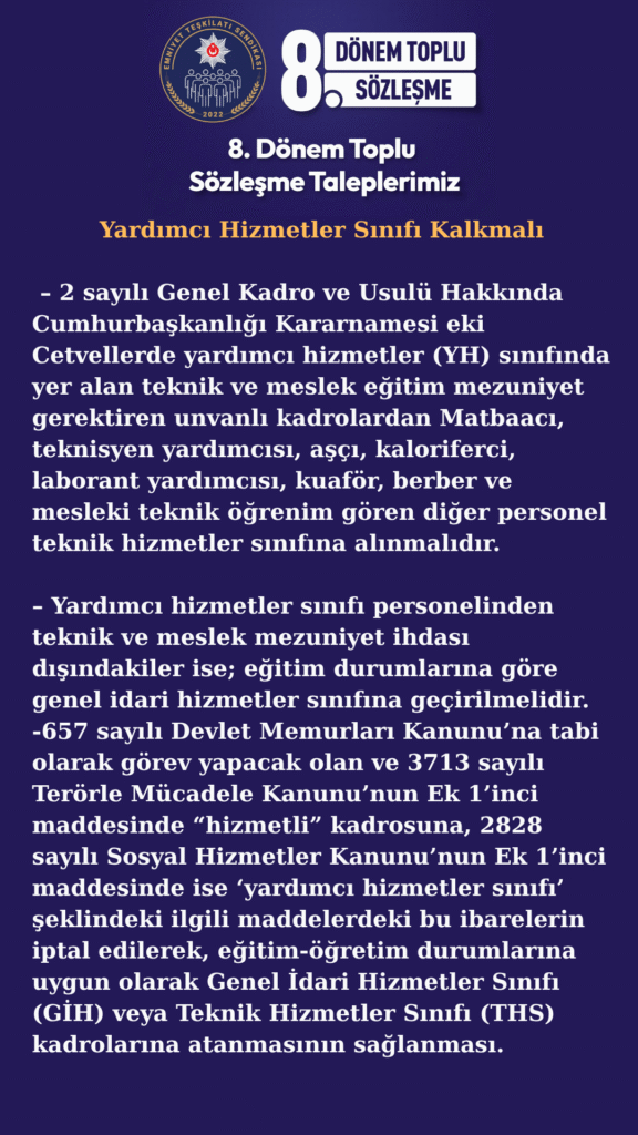-657 sayılı Devlet Memurları Kanunu’na tabi olarak görev yapacak olan ve 3713 sayılı Terörle Mücadele Kanunu’nun Ek 1’inci maddesinde “hizmetli” kadrosuna, 2828 sayılı Sosyal Hizmetler Kanunu’nun Ek 1’inci maddesinde ise ‘yardımcı hizmetler sınıfı’ şeklindeki ilgili maddelerdeki bu ibarelerin iptal edilerek, eğitim-öğretim durumlarına uygun olarak Genel İdari Hizmetler Sınıfı (GİH) veya Teknik Hizmetler Sınıfı (THS) kadrolarına atanmasının sağlanması.