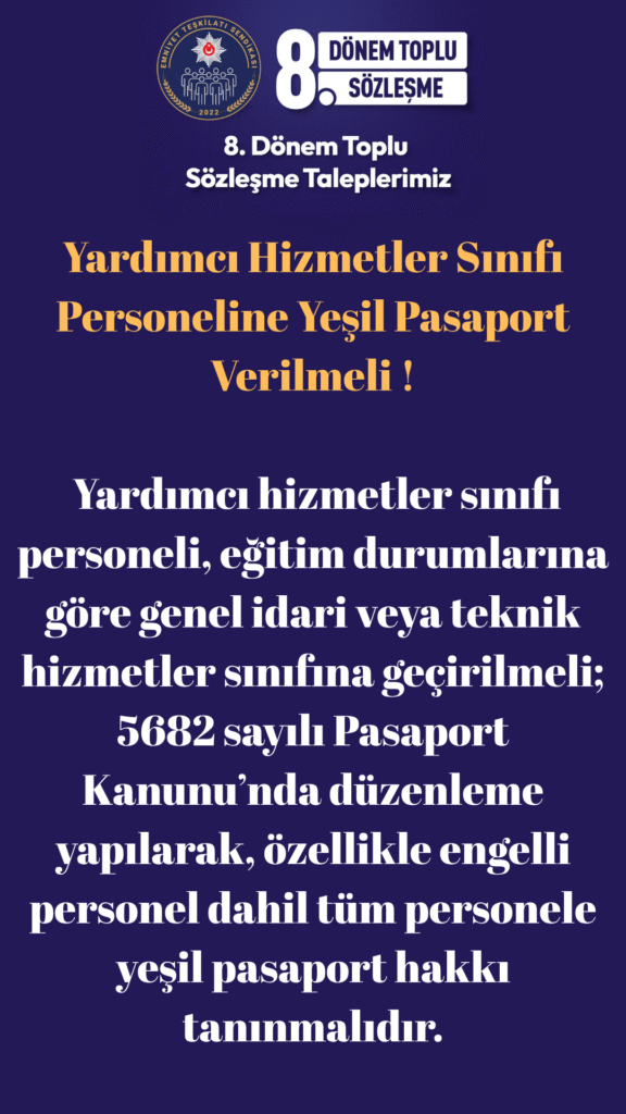 Yardımcı hizmetler sınıfı personeli, eğitim durumlarına göre genel idari veya teknik hizmetler sınıfına geçirilmeli; 5682 sayılı Pasaport Kanunu’nda düzenleme yapılarak, özellikle engelli personel dahil tüm personele yeşil pasaport hakkı tanınmalıdır.